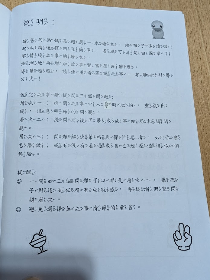 「請爸爸媽媽每週選一本繪本,陪孩子導讀喔! 起初請選擇內容簡單,畫風可清楚由圖案了解情境故事的繪本,漸漸地再增加故事豐富度或難度。 導讀過程,請使用看圖說故事,有趣的引導方式!